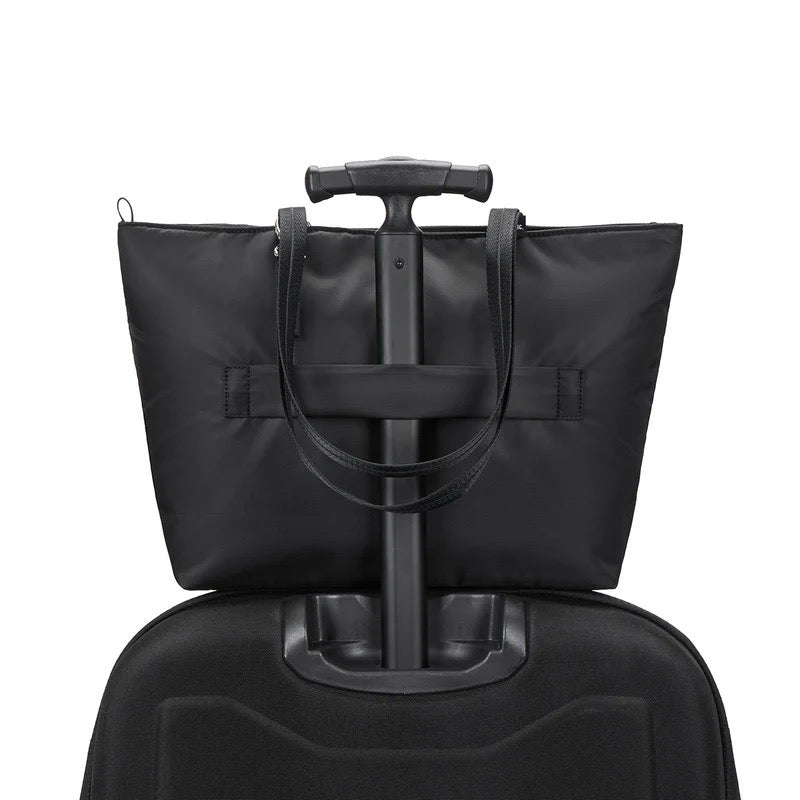 This spacious tote offers a refined, minimalist style, perfect for travel, work, or any situation requiring ample storage. Featuring a padded laptop compartment for secure tech storage, a luggage slip for easy transport, a front compartment for quick access, a spacious zippered RFID blocking pocket, various organizational pockets for your phone, pens, portable charger, and more. Discreet anti-theft features are integrated into the tote to provide you with peace of mind.