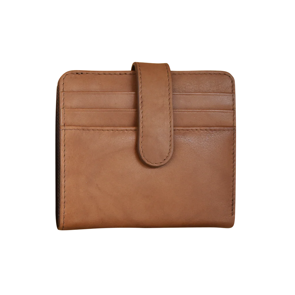 Leather snap bifold wallet with RFID blocking lining. Exterior - 6 credit card slots. Interior - six credit card slots, ID window, and currency compartment. Dimensions: 4.25 x 3.75 in.